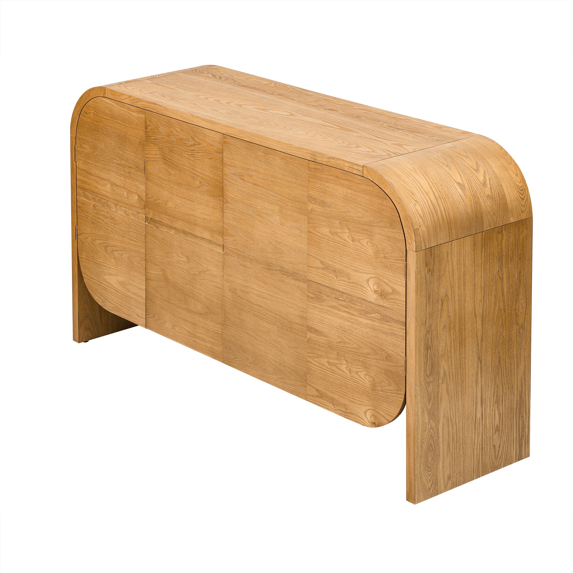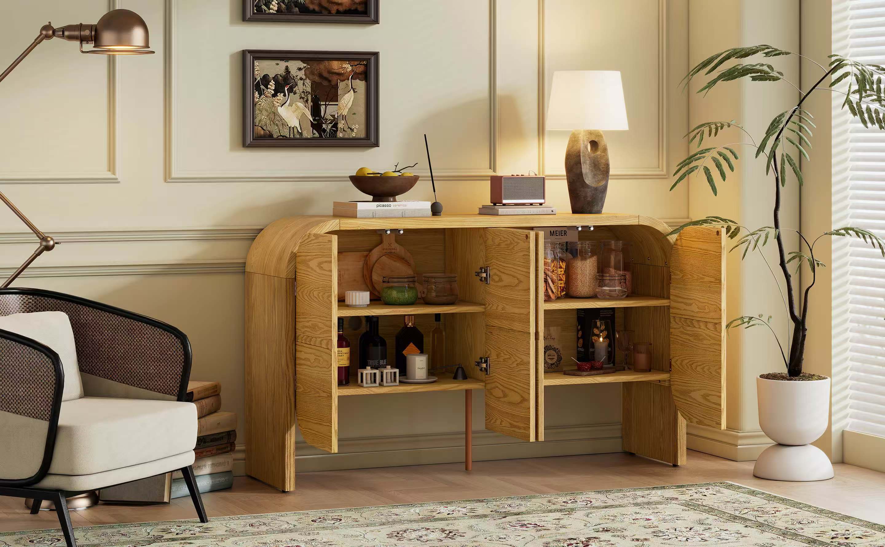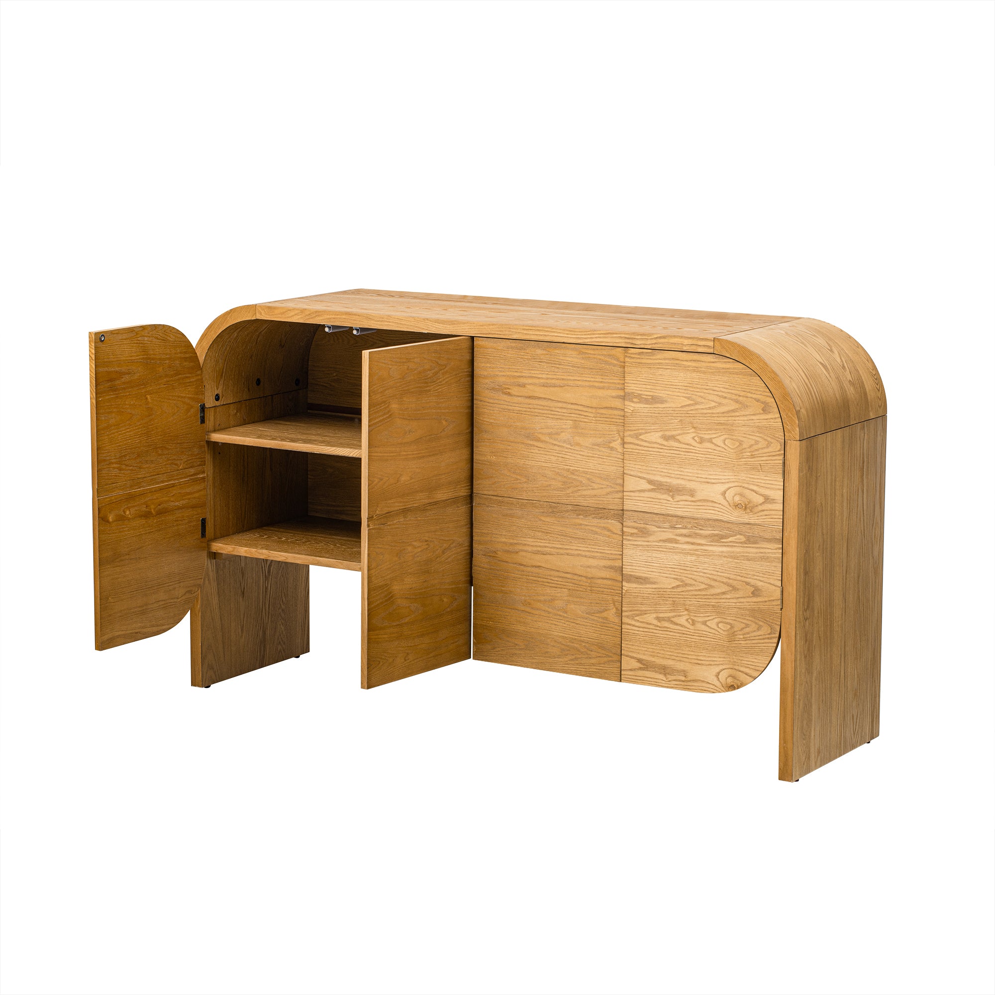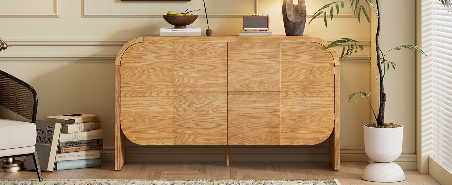 TREXM Buffet Cabinet with Storage, Wood Sideboard with Curvy Edge, 4 Doors Retro Credenza with Adjustable Shelves for Living Room, Kitchen – Natural