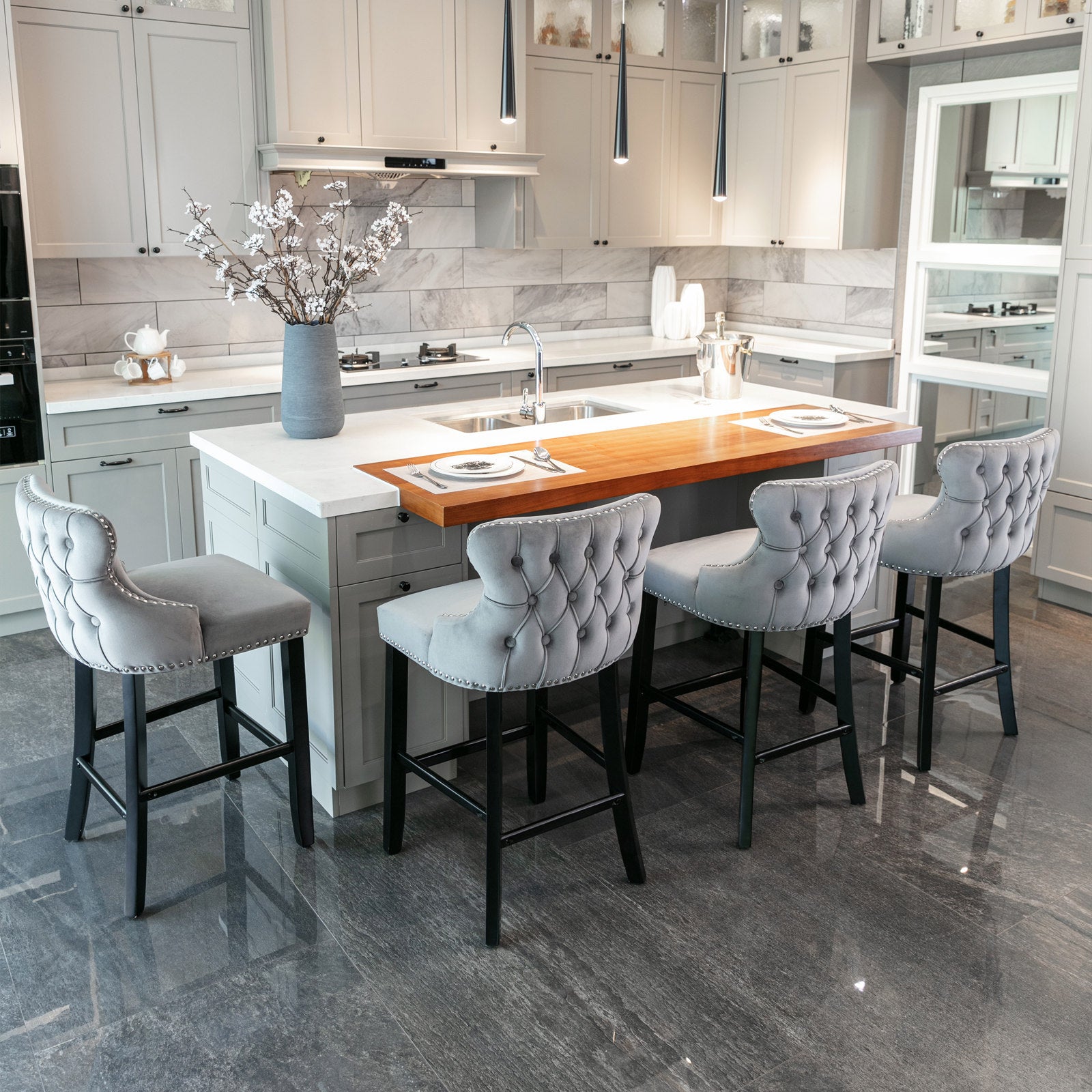 Upgrade your home bar or kitchen with these Contemporary Velvet Upholstered Wing-Back Barstools. Designed with a sleek gray velvet fabric, these bar stools feature button tufted detailing, wooden legs, and chrome nailhead trim for a touch of luxury. The leisure-style design offers comfort and style, perfect for modern kitchens, bars, or dining areas. Sold as a set of 4, these bar chairs provide both elegance and durability, with a sturdy construction that complements any decor. These stools are ideal for enjoying a drink or casual dining with friends and family.