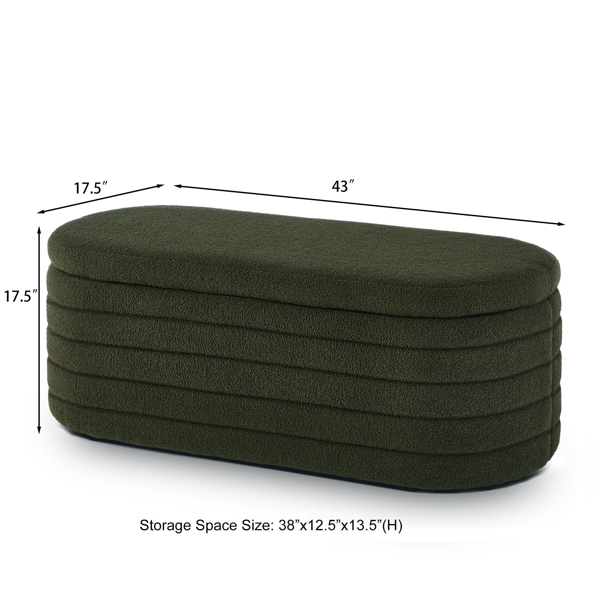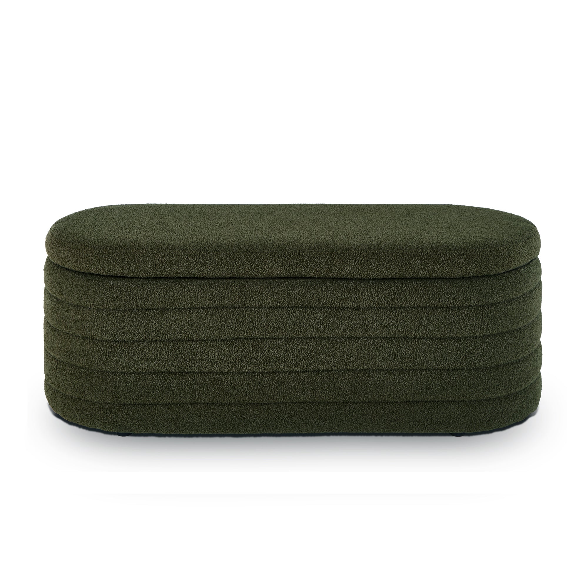 Product Description: Add a touch of luxurious style and smart functionality to your home with this modern oval storage ottoman bench. Upholstered in a plush, on-trend Dark Green boucle teddy fabric, this piece serves as a beautiful accent in any room. The hidden interior storage is perfect for blankets and pillows, while the integrated safety hinge ensures the lid closes gently and securely. Place this versatile end of bed bench in your bedroom, living room, or entryway for an effortlessly chic and organized space.