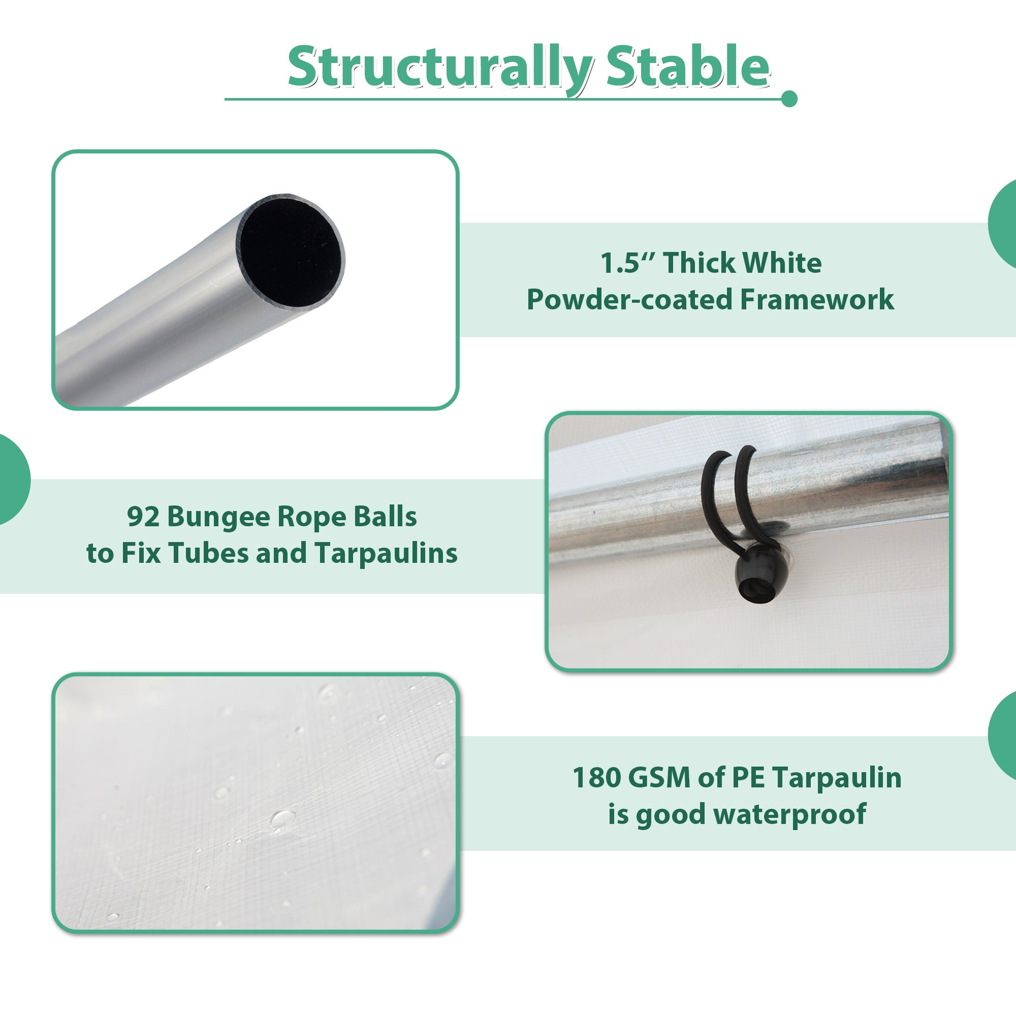 • 【Stability】 Additional corner support beams form a unique triangular structure, 4 eaves each with support tubes, and 6 sets of support tubes on the roof,making the top roof frame more stable and solid; The extra grounding pole makes the tent more stable and more resistant to wind on the ground. But when the wind speed reaches 38 mph or higher, you'll also need to set up a windbreak rope and use expansion screws on the concrete surface.