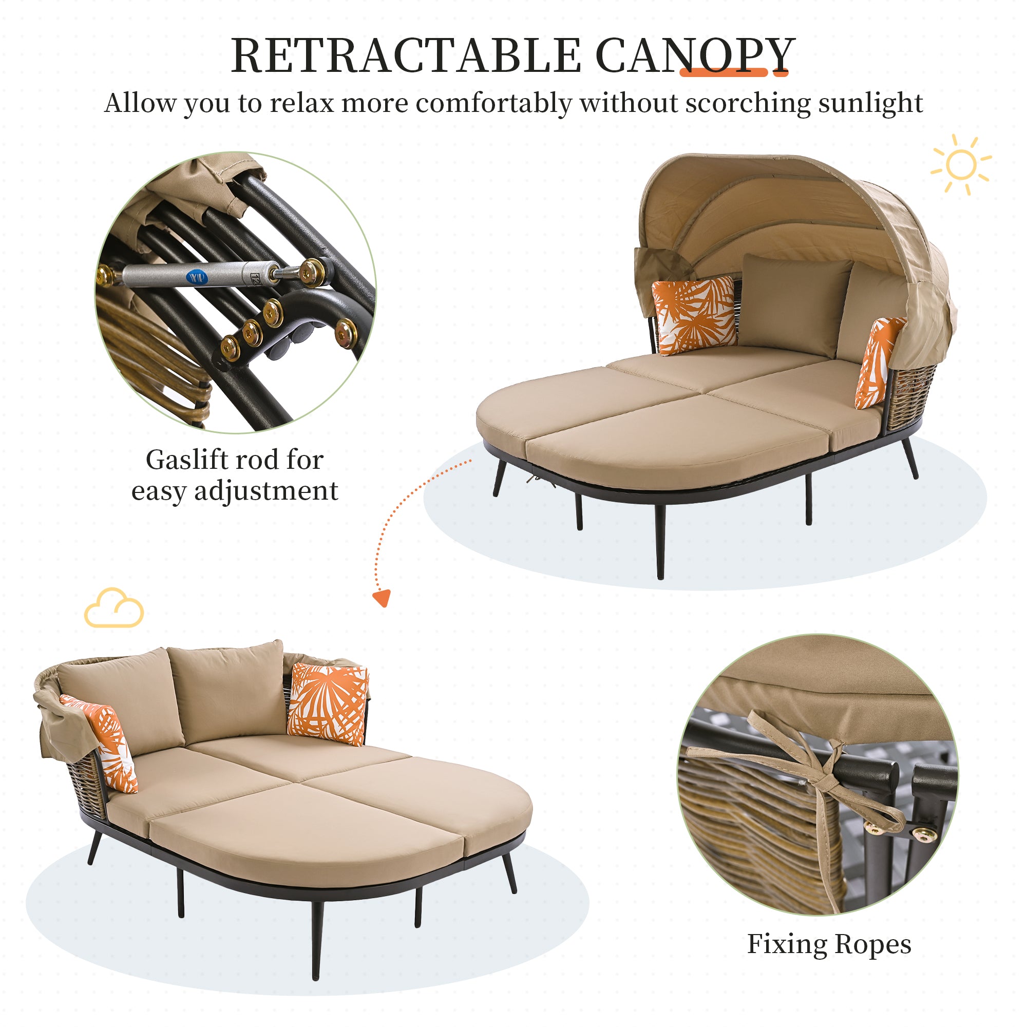 | Summary | Upgrade your outdoor lounging experience with our fashion patio daybed! Featuring a sturdy metal frame and a chic rattan back, this daybed comes with a retractable, gaslift-controlled canopy fixed by straps for customizable comfort. It includes four soft cushions with a 4-inch thickness, plus two back pillows and two colorful throw pillows for added flair. The cushion covers are easily washable, thanks to convenient zippers. Adjustable feet ensure stability on any surface, and a robust 700lbs weight capacity accommodates 2 people. Transform your patio into a relaxing retreat today! |