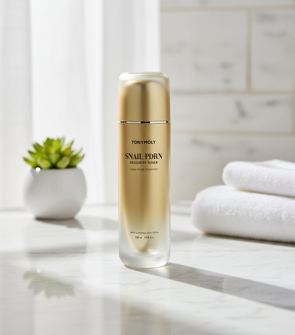 Prepare your skin for optimal absorption with the powerful TONYMOLY Snail PDRN Recovery TONER (120ml). This advanced K-Beauty Anti-Aging Essence Toner is the vital first step after cleansing, utilizing a potent complex of nourishing Snail Secretion Filtrate and cutting-edge PDRN (Polydeoxyribonucleotide) technology. This luxurious formula balances the skin's pH, drenches it in intense hydration, and promotes cellular recovery, improving texture and visible elasticity. Use daily to soothe, prep the skin barrier, and maximize the benefits of subsequent serums and creams. Perfect for skin needing deep restorative preparation and firmness.