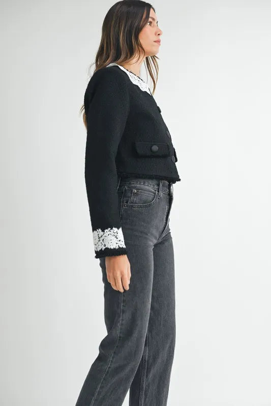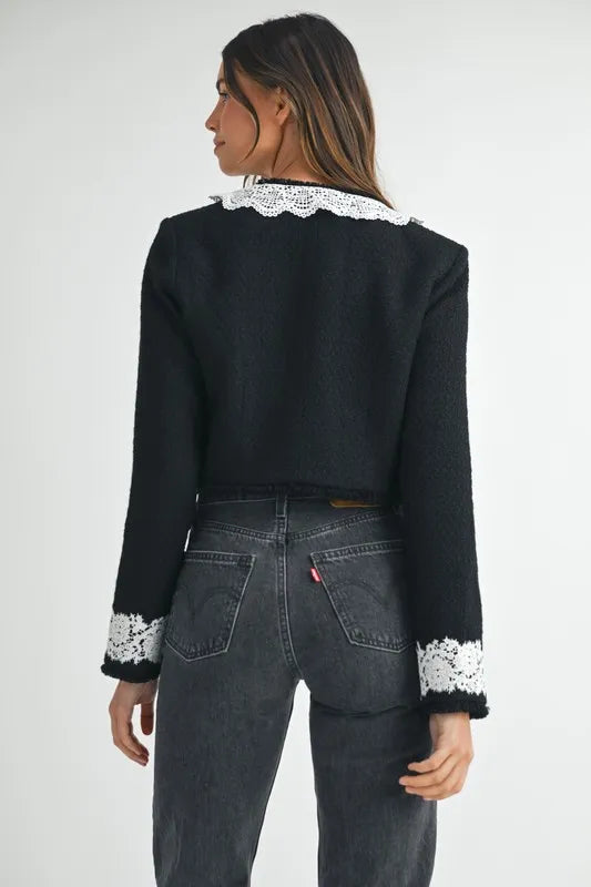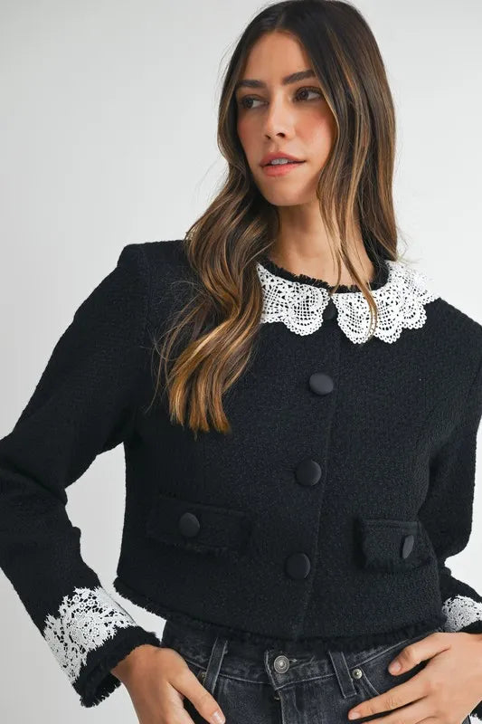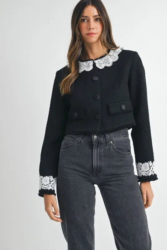 MABLE Lace Trim Collar Tweed Crop Jacket