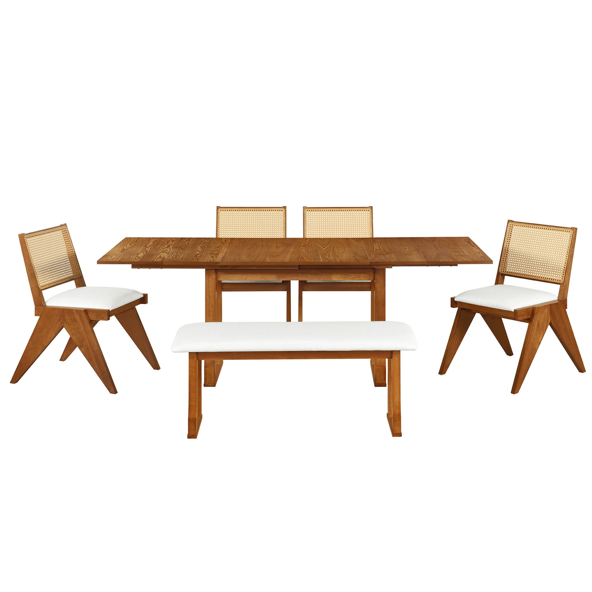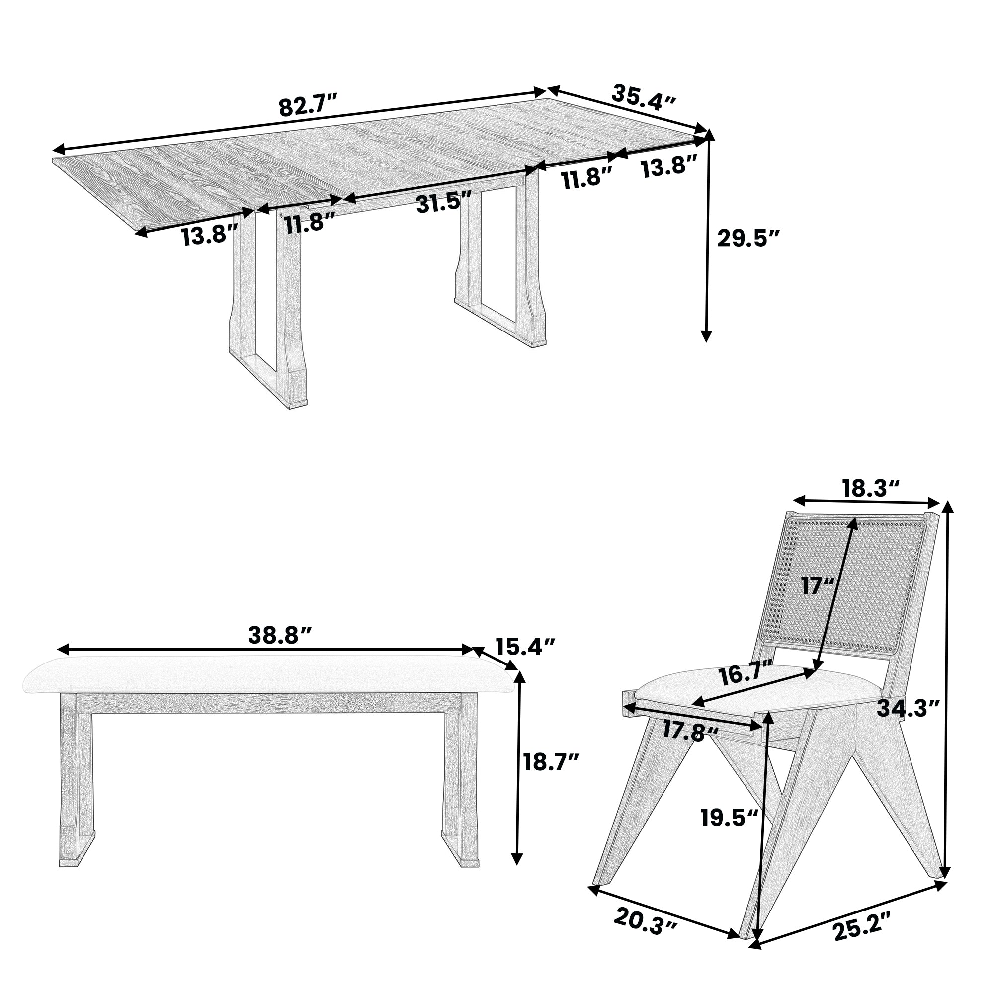 Summary Upgrade your dining space with this 6-piece solid wood dining set, designed for both style and functionality. The extendable table features two 11.8" removable leaves, expanding from 59.1" to 82.7", perfect for hosting family and friends. Enjoy ultimate comfort with upholstered chairs and bench, complemented by stylish wicker chair backs and ergonomic design. Built to last, each piece supports up to 250 lbs with solid construction and chic legs. Available in two elegant colors to suit your décor!
