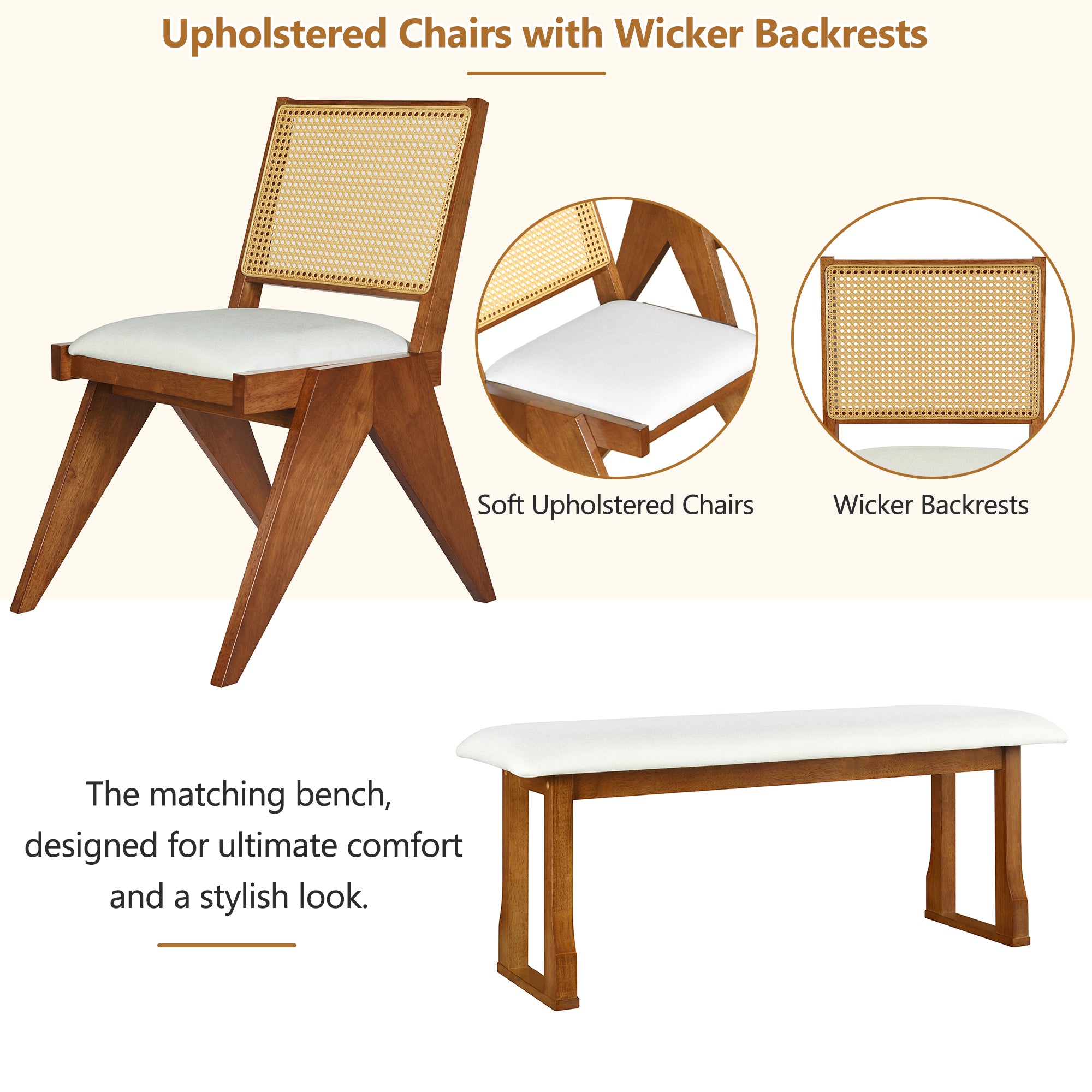• [Upholstered Chairs with Wicker Backrests] The set includes soft upholstered chairs and a matching bench, designed for ultimate comfort and a stylish look. Wicker backrests add a touch of sophistication and ergonomic support, ensuring you enjoy every meal in complete relaxation. This thoughtful combination of materials enhances both the aesthetic and functional appeal of your dining area.