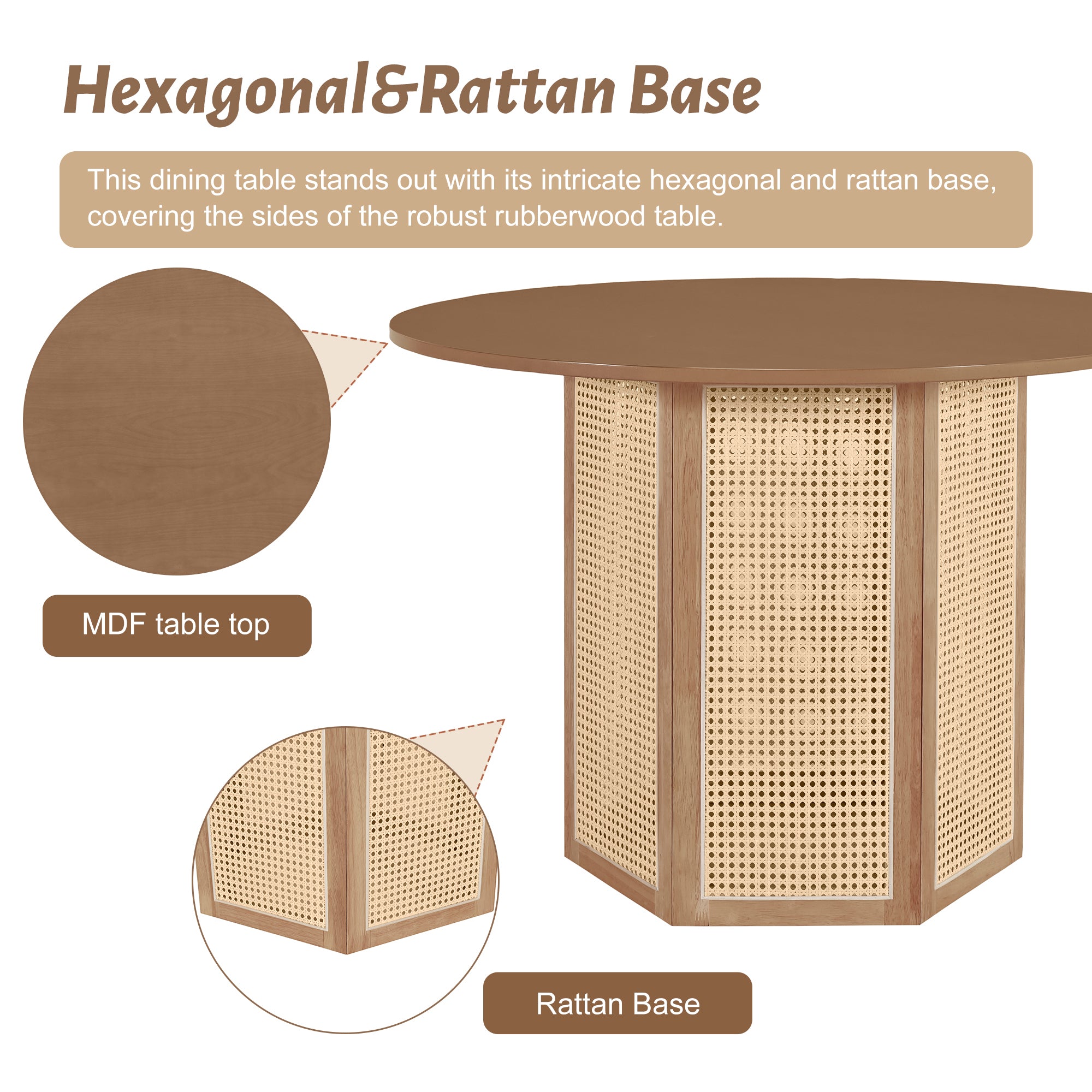 • [Hexagonal&Rattan Base] This dining set stands out with its intricate hexagonal and rattan base, covering the sides of the robust rubberwood table and adorning the chair frames. The six-sided weave is not only a testament to traditional craftsmanship but also provides a distinct aesthetic that captures the natural elegance of rattan art, providing a warm, inviting atmosphere to any dining room.