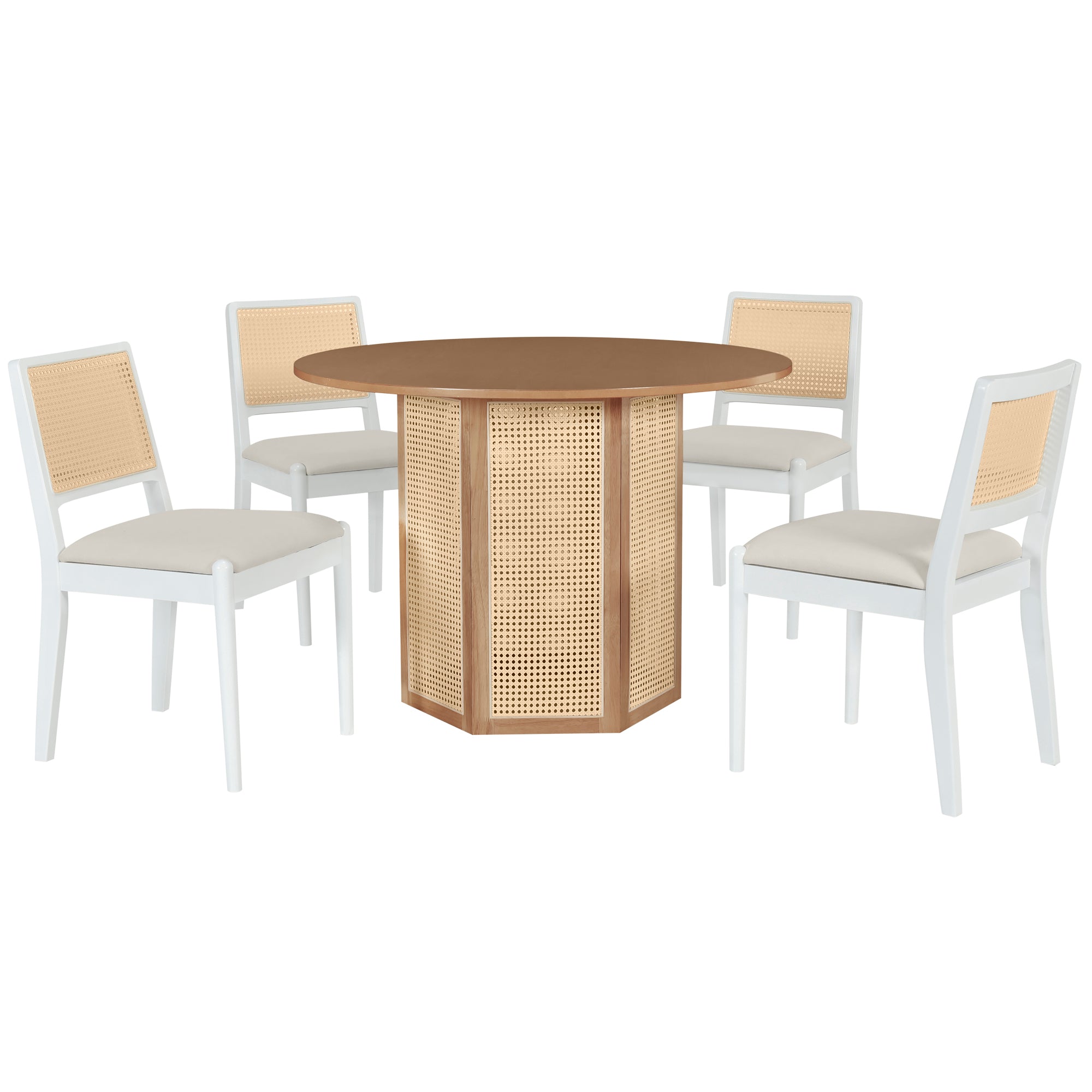 TOPMAX 5-Piece Rattan Round Dining Table Set, Wood Table with Hexagonal Base and Upholstered Chairs for Dining Room, Kitchen,Indoor Use, White+Beige