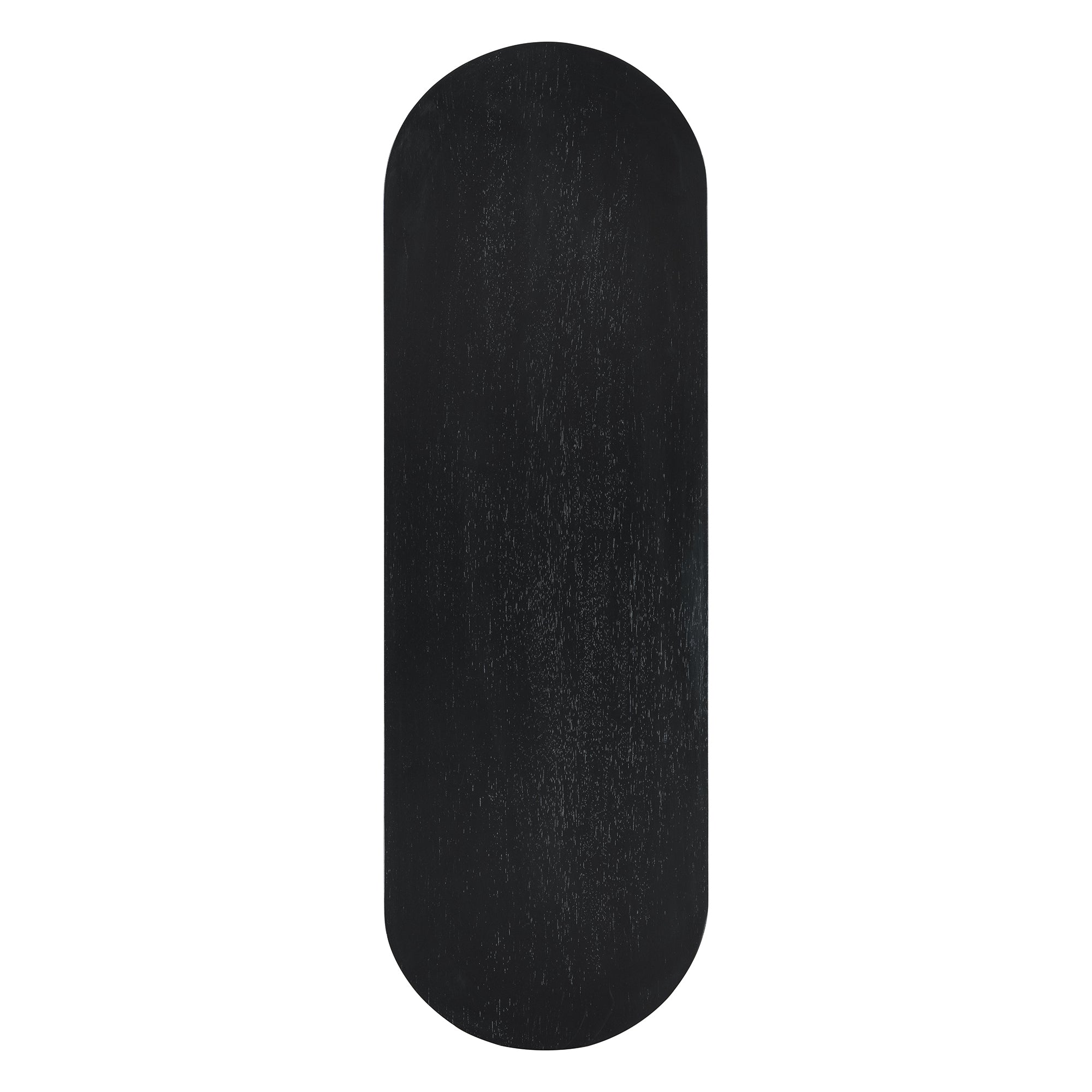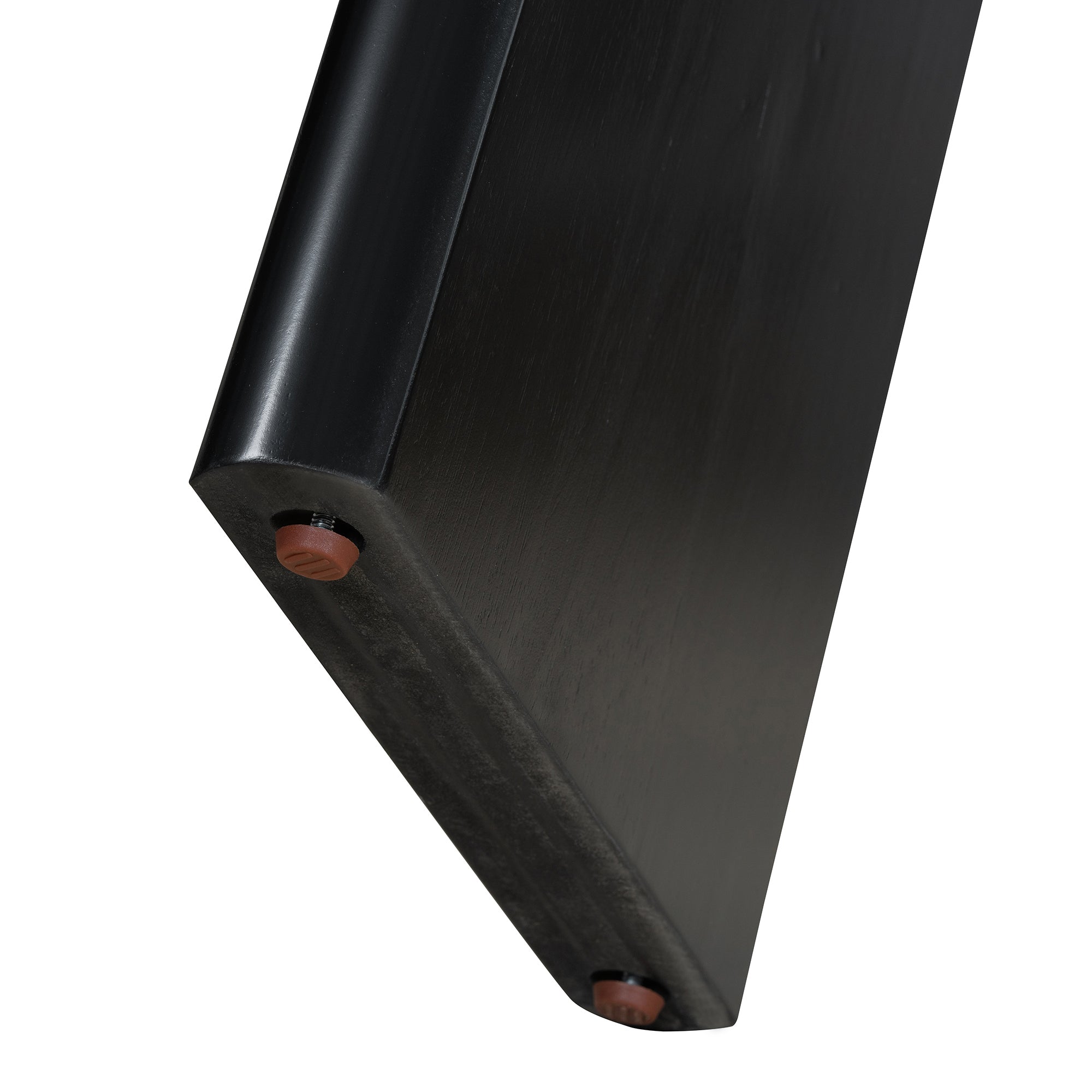 This modern minimalist console table features sleek lines and a unique elegance. The tabletop is rectangular with rounded corners, finished in matte black, exuding style and sophistication. A horizontal support bar between the legs adds structural integrity and visual depth. This console table is a testament to fine craftsmanship, blending quality materials with meticulous attention to detail.