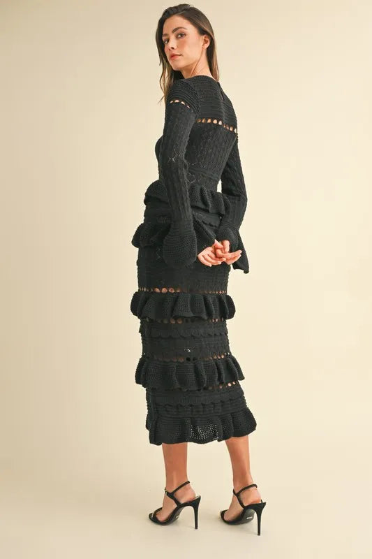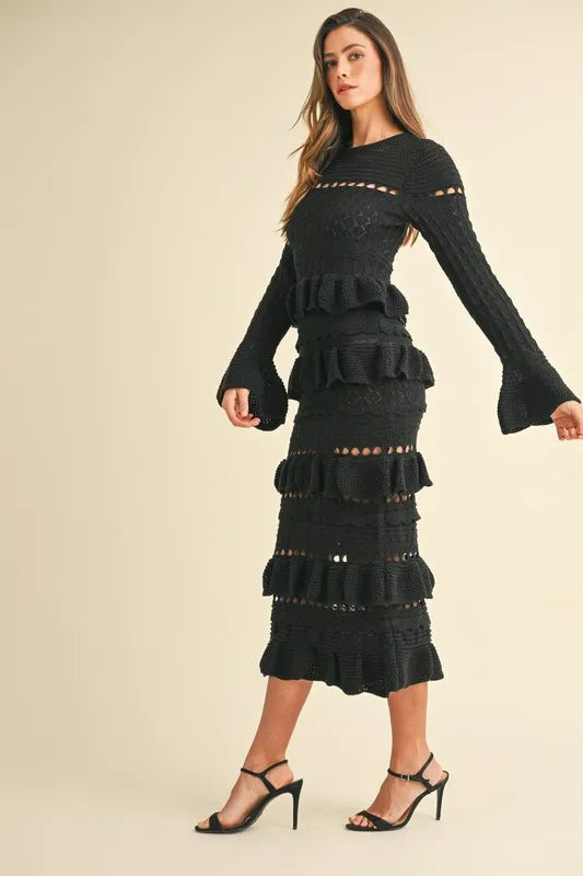 This midi dress features long sleeves and tiered ruffle details, adding a touch of femininity and charm to the look. The knit fabric offers comfort and style, making it perfect for various occasions. Elevate your wardrobe with this elegant long sleeve tiered ruffle knit midi dress.