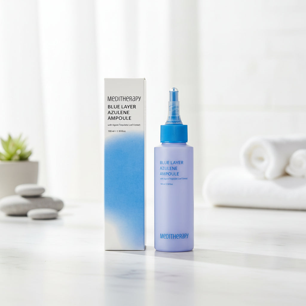 Experience intensive relief and deep repair with the MEDITHERAPY Blue Layer Azulene Ampoule 100ml. This uniquely formulated Ampoule features a calming Blue Layer enriched with concentrated Azulene, a powerful ingredient derived from Chamomile known for its extraordinary soothing and anti-inflammatory properties.