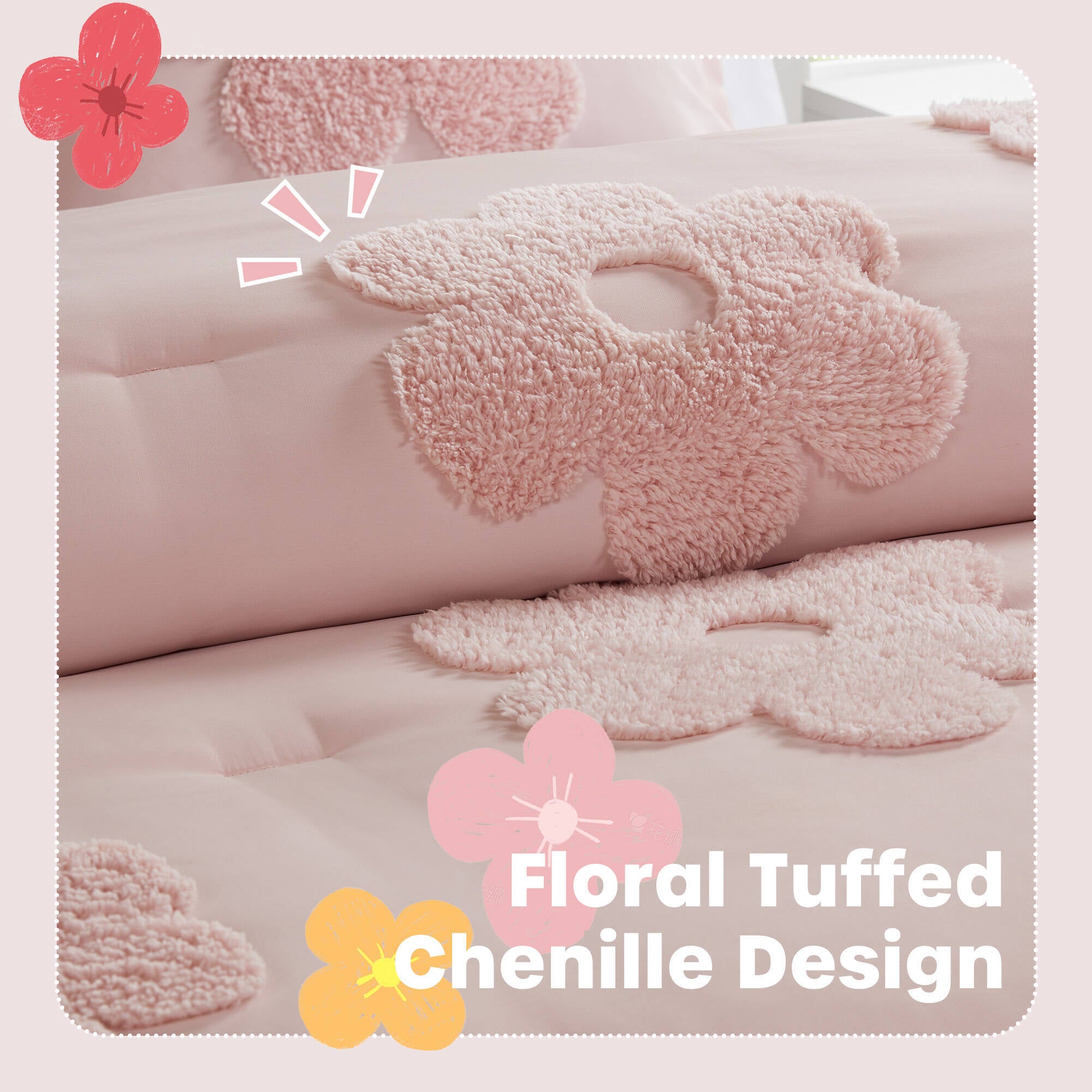 • Features a floral tufted chenille design for a fun look