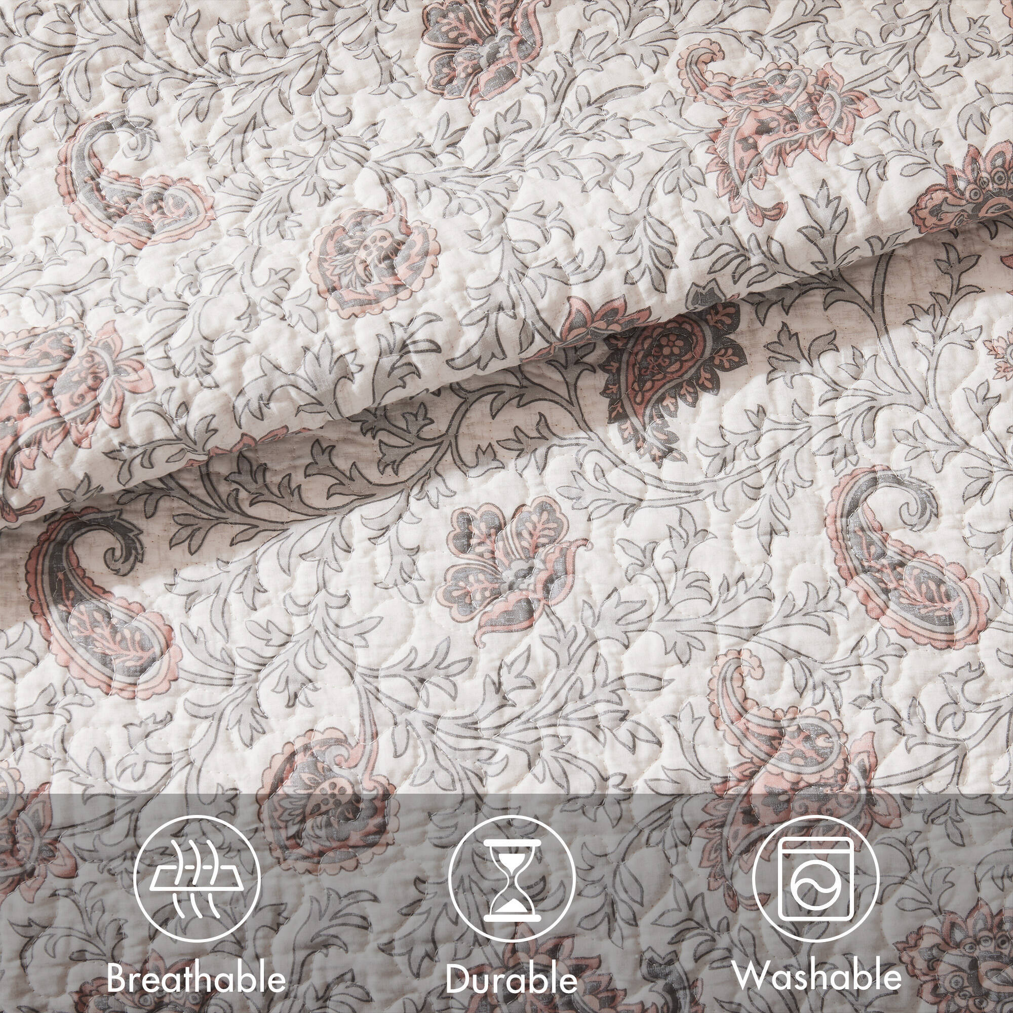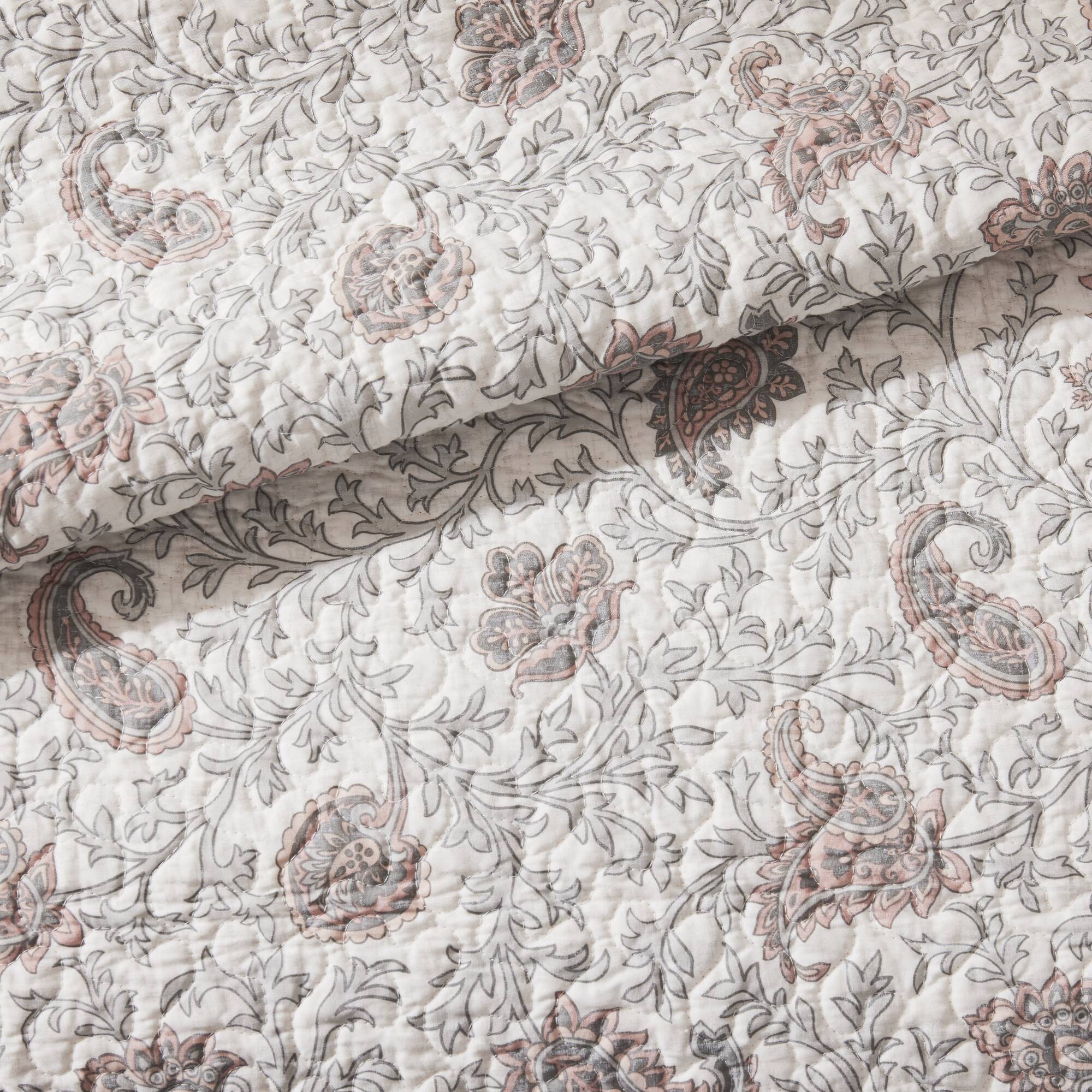 The Madison Park Dawn 6 Piece Cotton Percale Reversible Quilt Set offers a shabby chic update to your bedroom decor. A paisley print is featured on the cotton quilt with pintucked fabric separated by lace taping embellishments. Matching shams mirror the design of the quilt, while three decorative pillows and a solid bedskirt complete this reversible farmhouse quilt set. This bedding set is also OEKO-TEX certified, meaning it does not contain any harmful substances or chemicals to ensure quality comfort and wellness. A coordinating shower curtain is available and sold separately. Items in the set may come in a rolled or compressed packaging, which will need to be fluffed up or steam ironed before use to remove wrinkles.