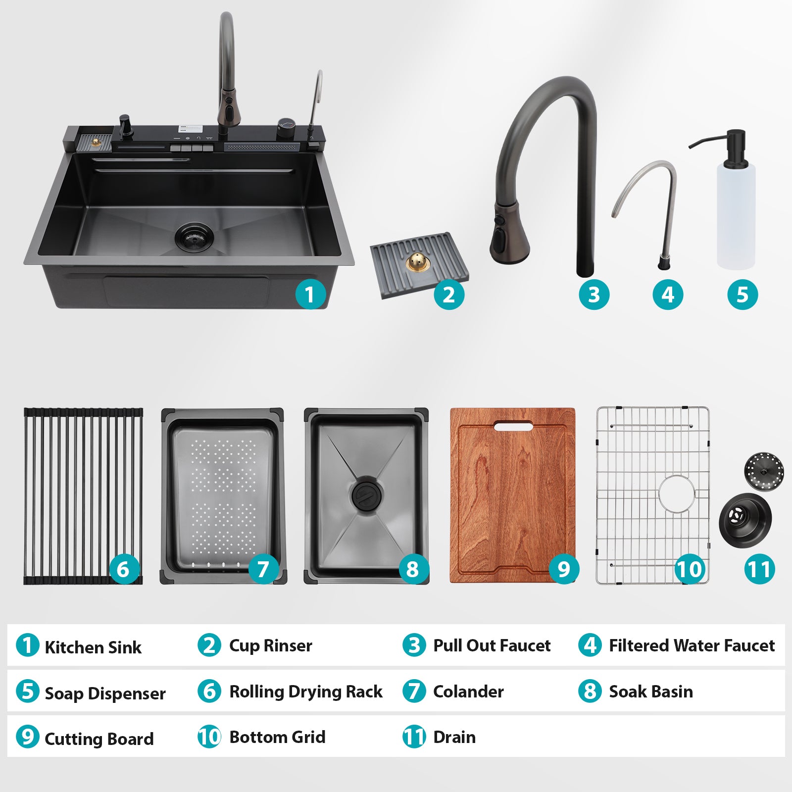 • [Included in the Package] Comes with this kitchen sink: 1 x 304 stainless steel dish grid, 1 x soap dispenser, 1 x drain assembly, 1 x drying rack, 1 x cutting board, 1 x colander, 1 x pull-down faucet, 1 x filtered water faucet, 1 x cup rinser, 1 x soak basin, 1 x installation clips, 1 x cutout template and installation Guide.