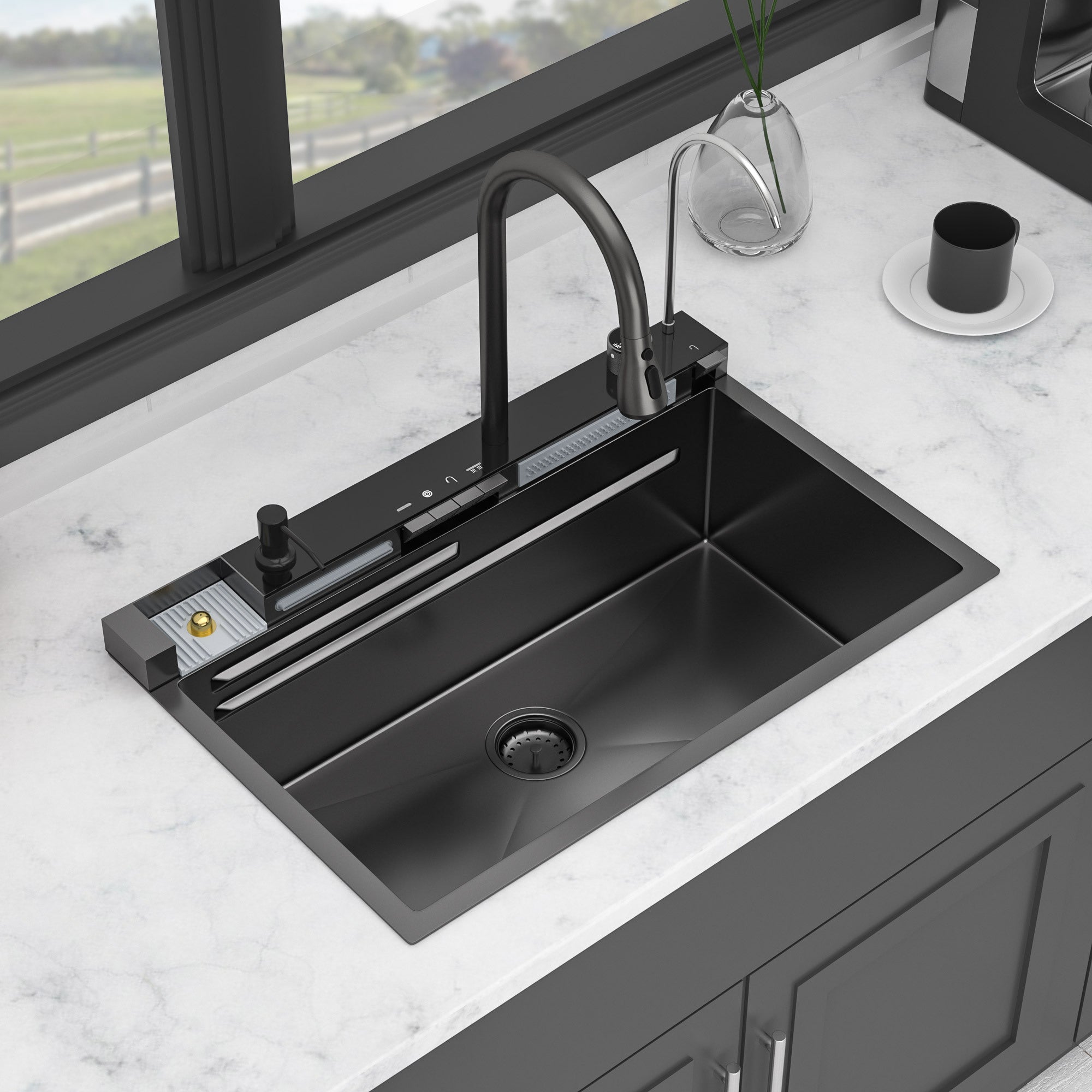 Gunmetal Black 30' Stainless Steel Whale Digital Waterfall Sink with LED Display, 16 Gauge Single Bowl Ledge Workstation
