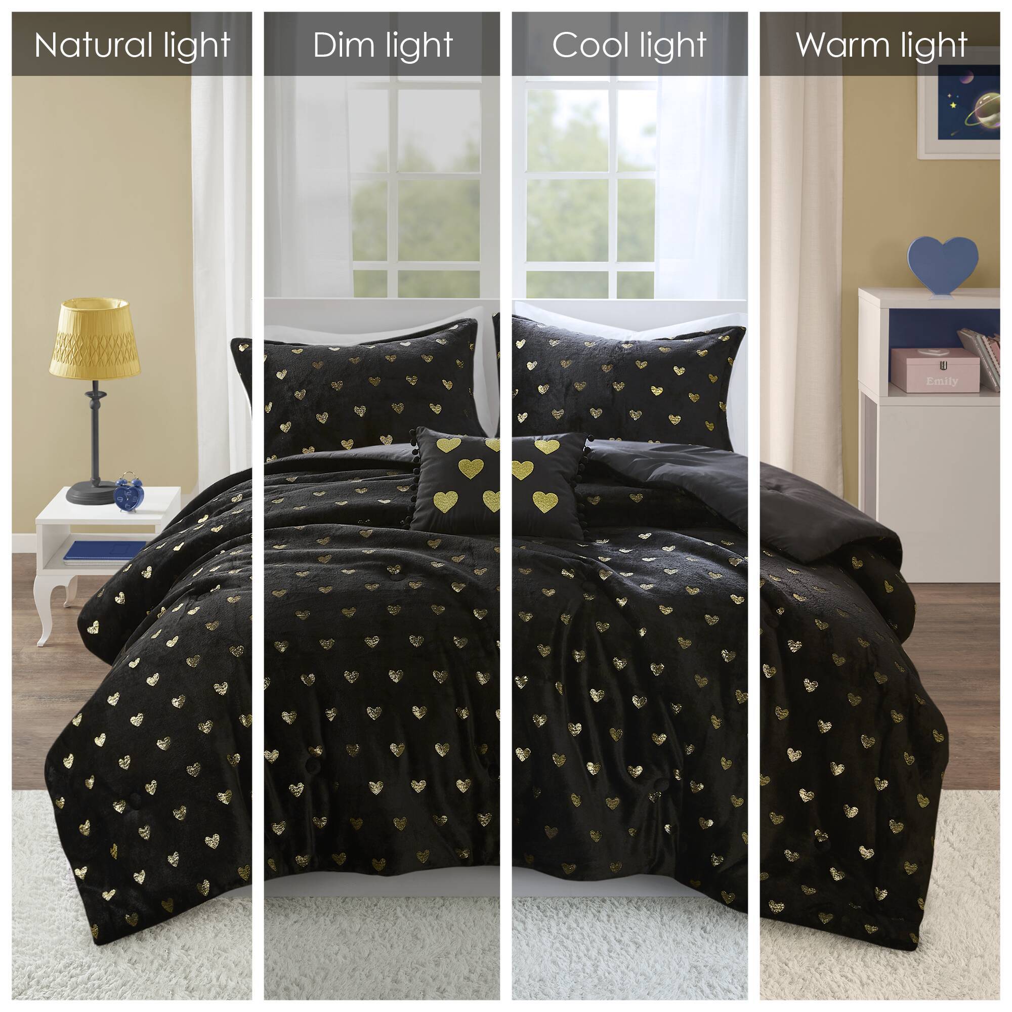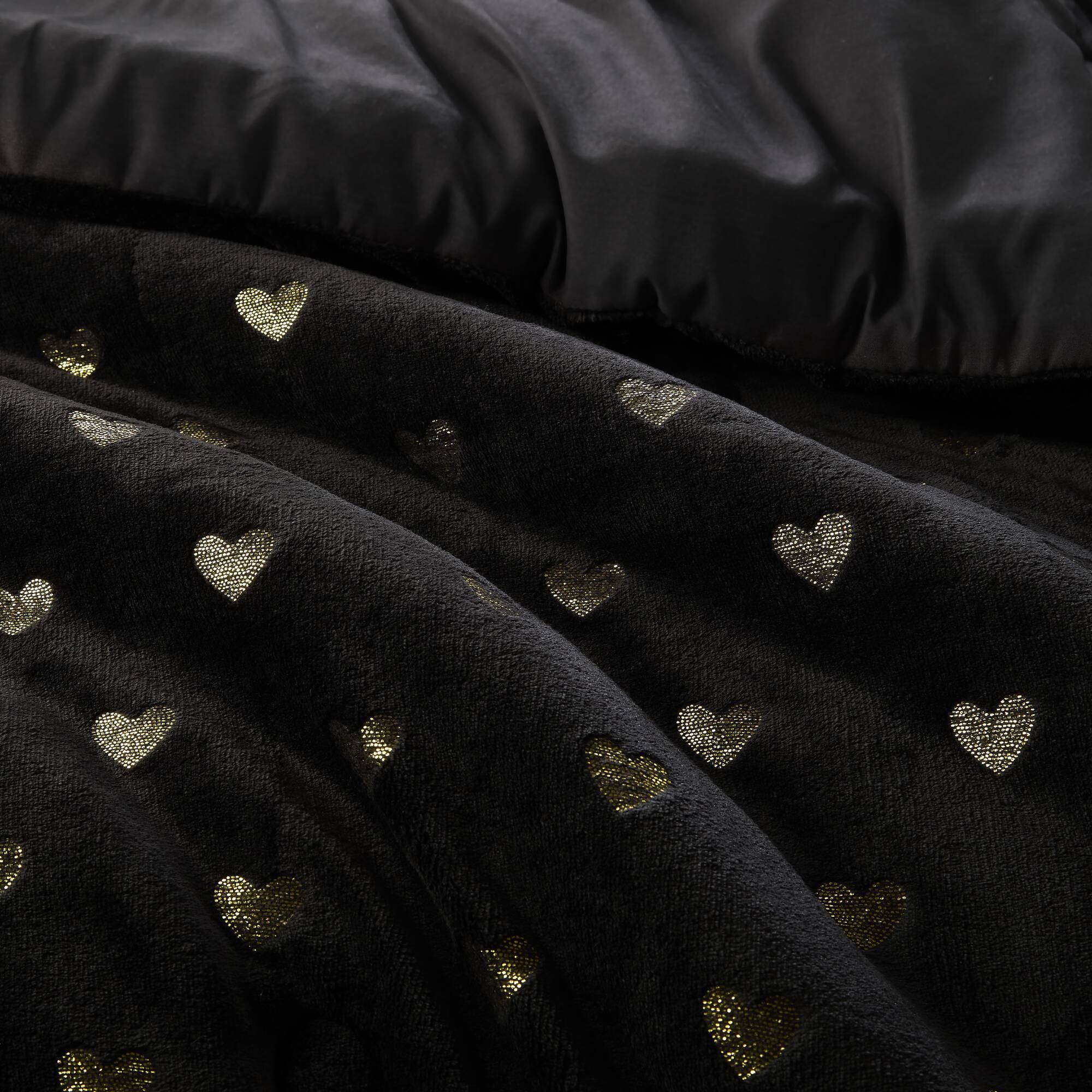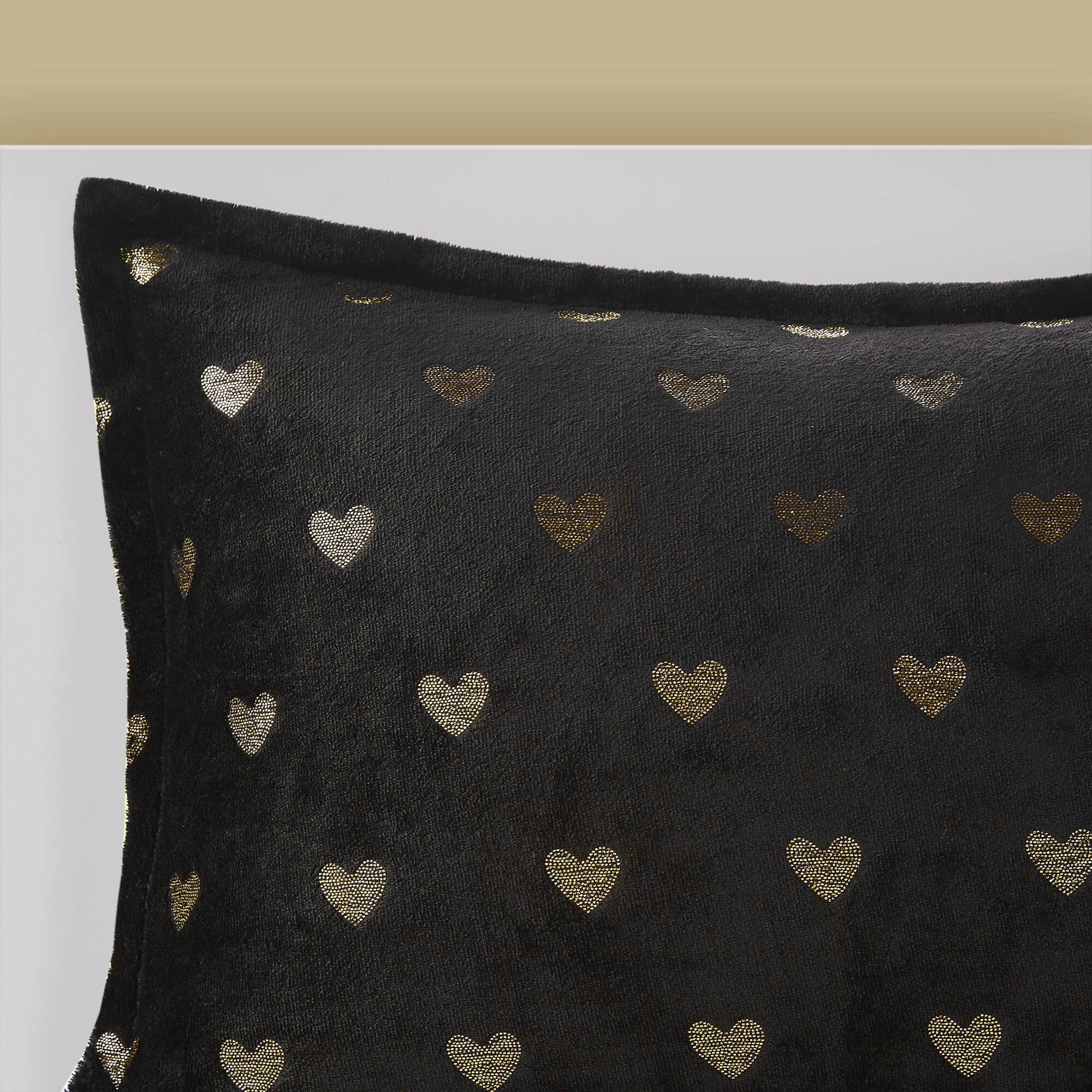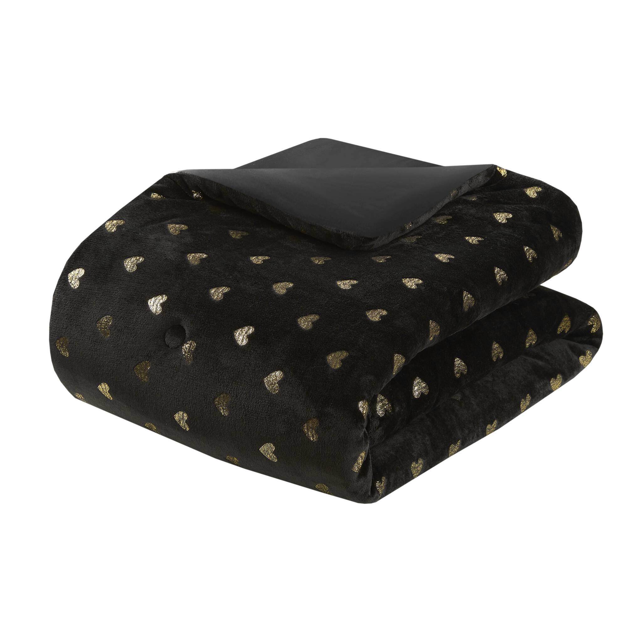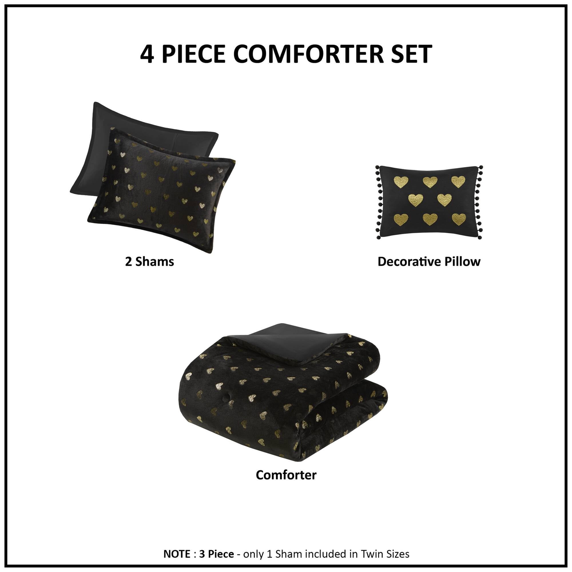 4 PCS Full/Queen Metallic Printed Plush Comforter Set with Throw Pillow Black/Gold