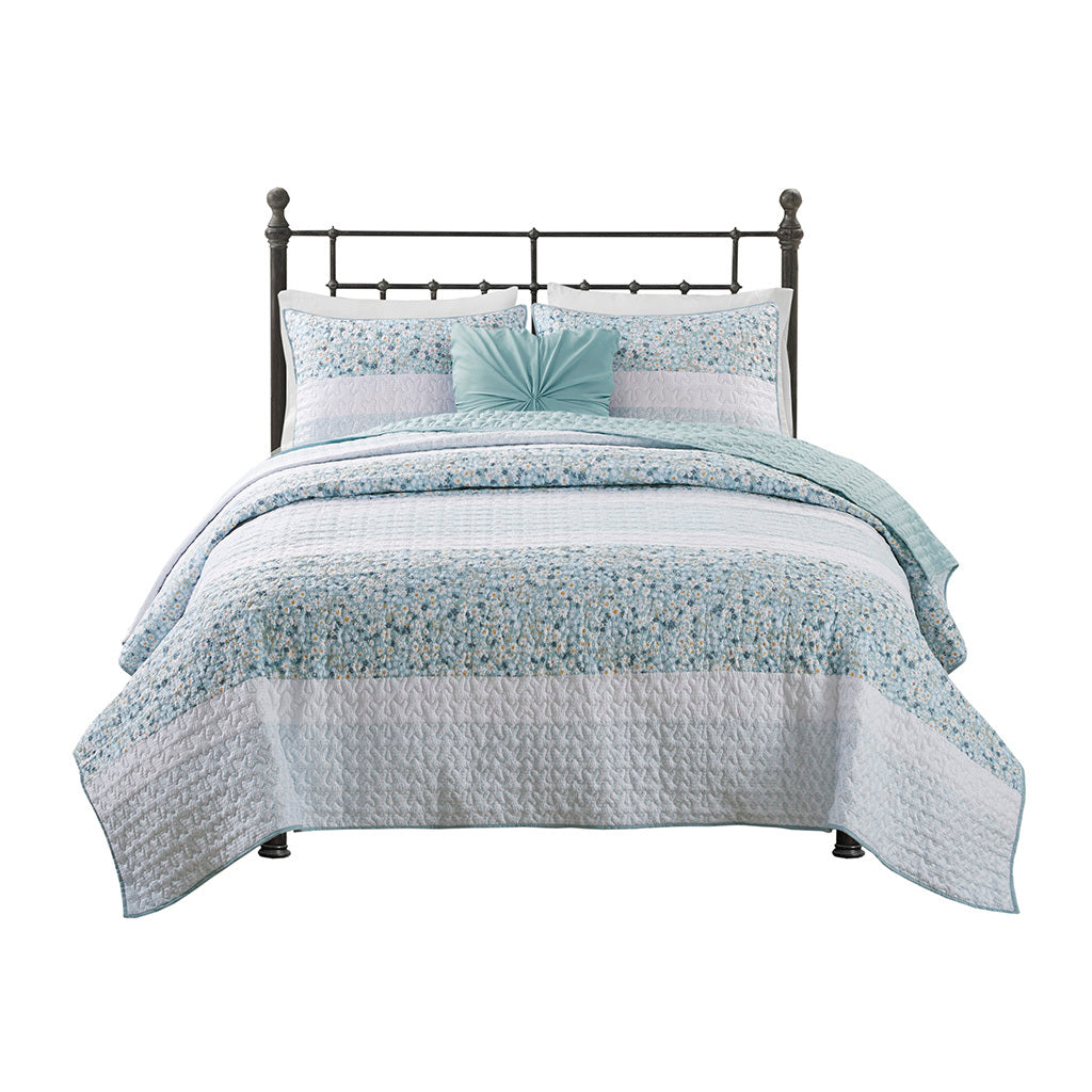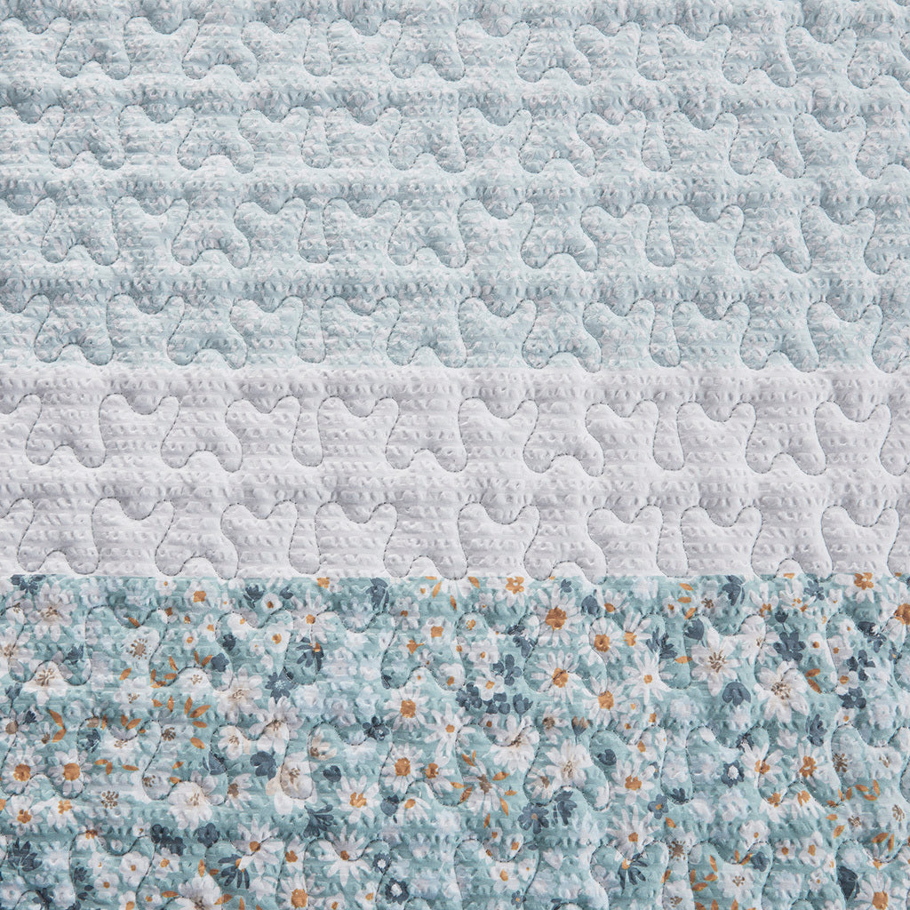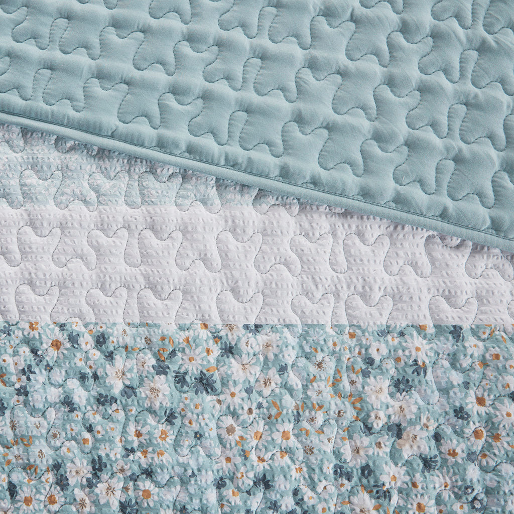 Featuring three different floral and botanical print designs with a vermicelli quilt stitch pattern, this seersucker microfiber quilt set exudes shabby chic/farmhouse style that adds a touch of elegance to any bedroom. The solid decorative pillow features gathered fabric adding to the overall charm of the set. Colors featured in this set include various shade of aqua, blue, green, yellows, and whites. The quilt and pillows are filled with hypoallergenic polyester filling that is treated to be dustproof, ensuring a restful and comfortable sleeping experience. This machine washable bedding set features an antimicrobial treatment, which inhibits bacteria growth and keeps the bedding fresher for longer.