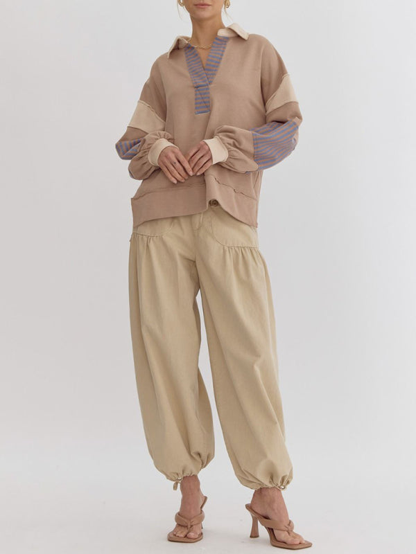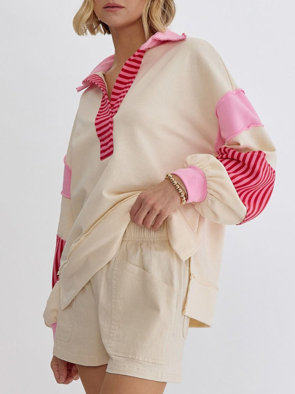 Women's Sweatshirt OversizedPolo Neck Striped Colorblocking Top