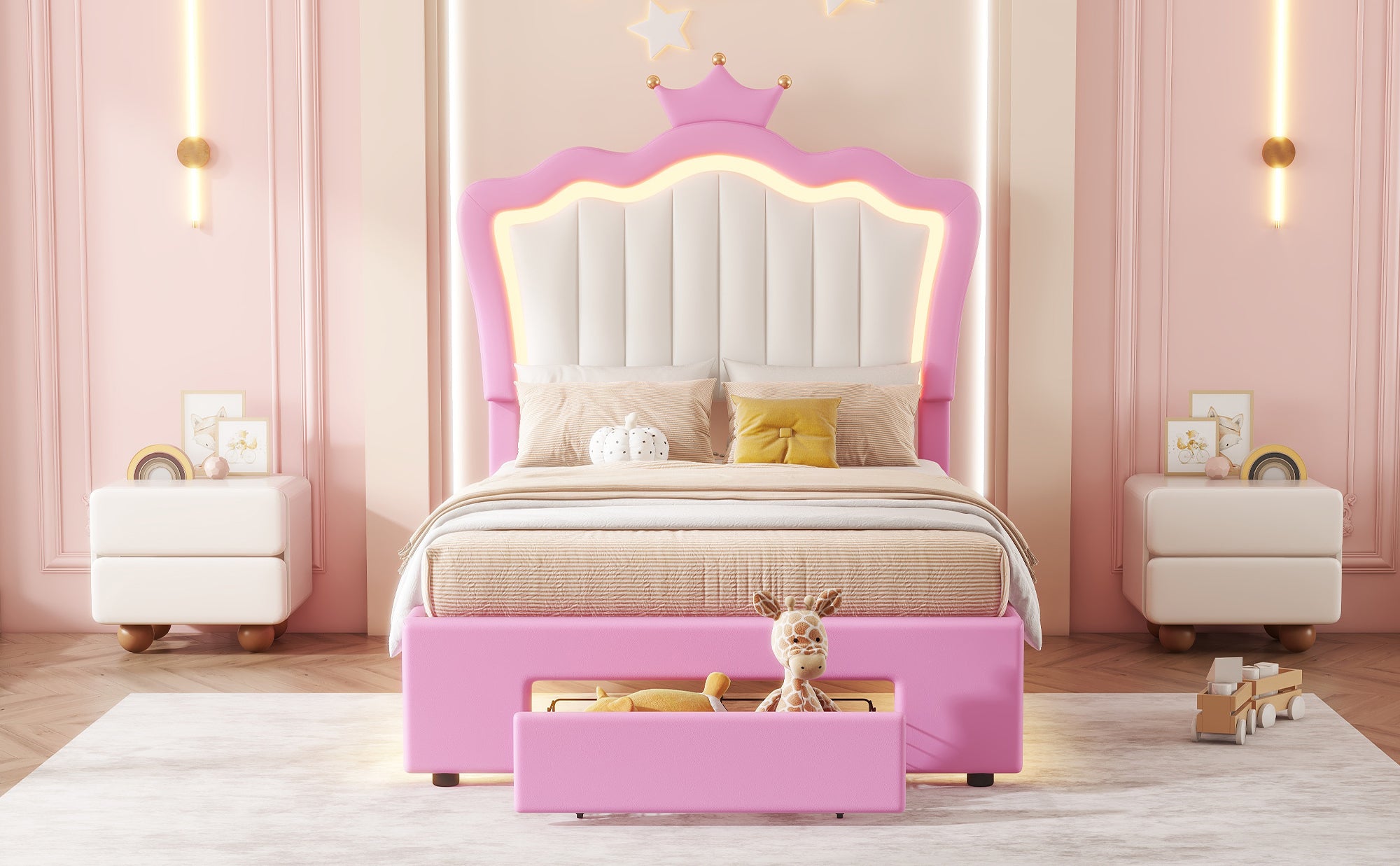 Twin Size Upholstered Bed Frame with LED Lights, Modern Upholstered Princess Bed with Crown Headboard, a Drawer, Pink+White